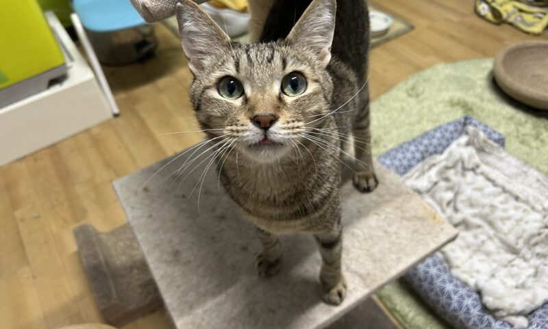 キャットタワーに上がって、早く早く~と訴えるひろくん